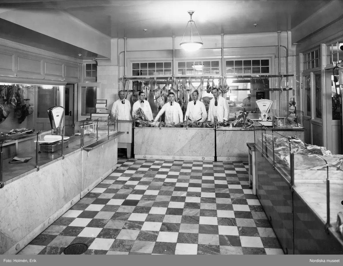Nordiska Kompaniets köttavdelning. Män vid köttdisken.