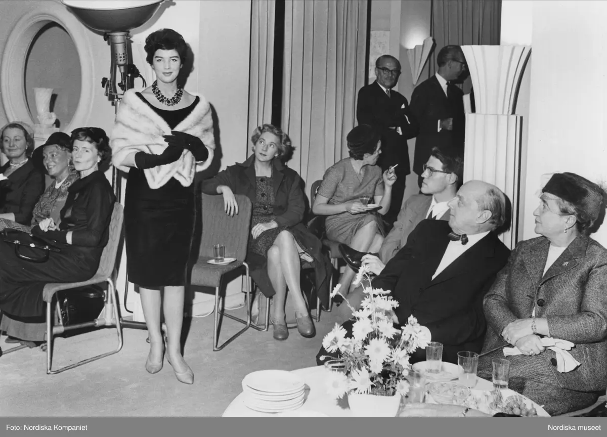 Pälsuppvisning på Nordiska Kompaniet, Franska avdelningen. En kvinnlig modell visar en stola av ljus päls. Vid små bord sitter kvinnor och och män och ser på. 2 november 1959.
