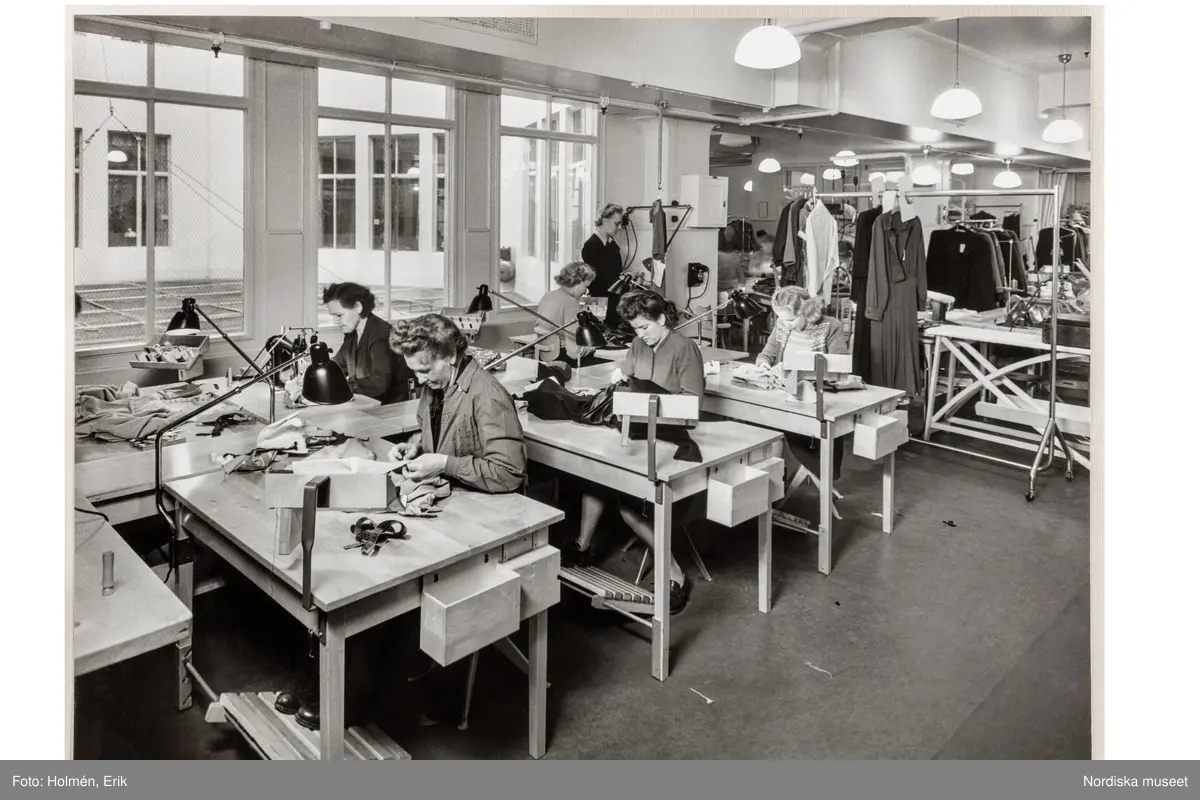 Beklädnadsateljéerna på NK (Nordiska Kompaniet). I lokalen arbetar kvinnor med sömnadsarbeten. I bakgrunden står klädställning med hängande plagg.