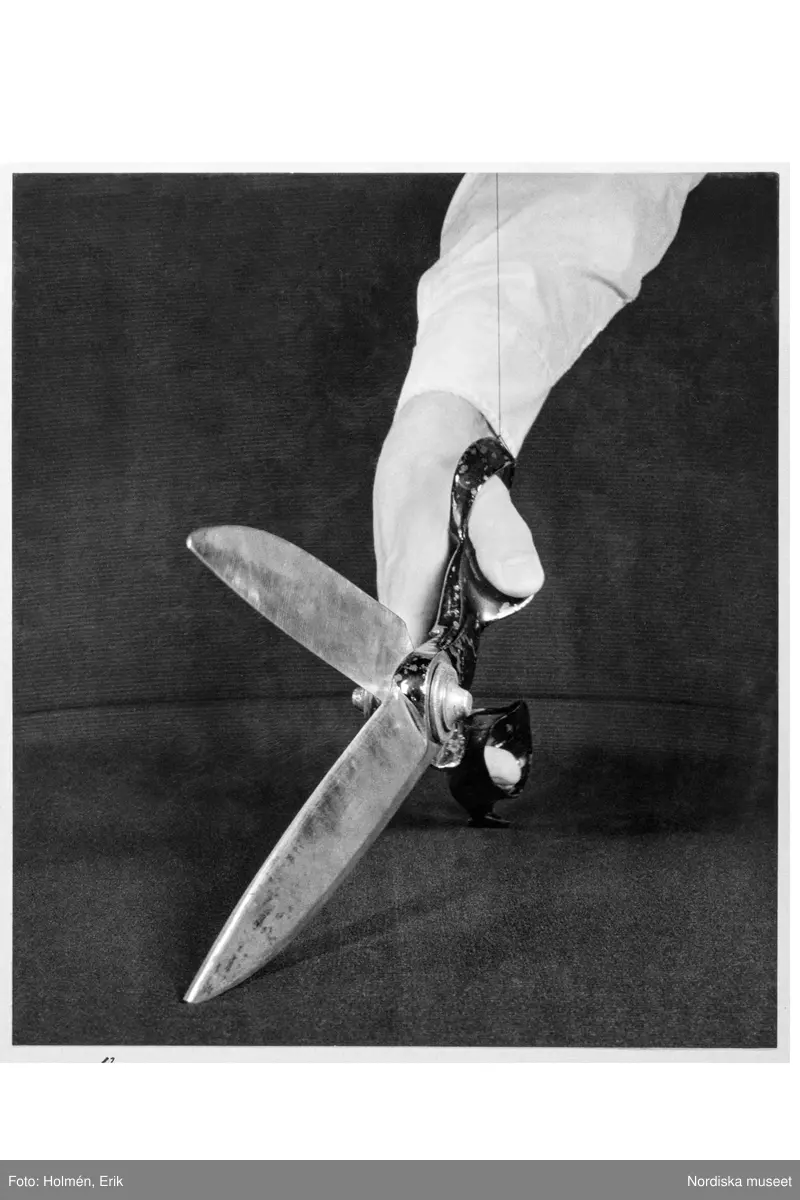 En hand håller en sax med öppna skär mot en bakgrund av mörkt tyg. Bilden avsedd för annons för varuhuset Nordiska Kompaniet (NK) i Stockholm.