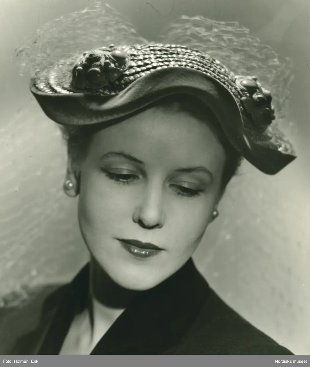 Porträtt av kvinna i grå sammetshatt med guldfärgat strå. Modell av Jean Barthet.