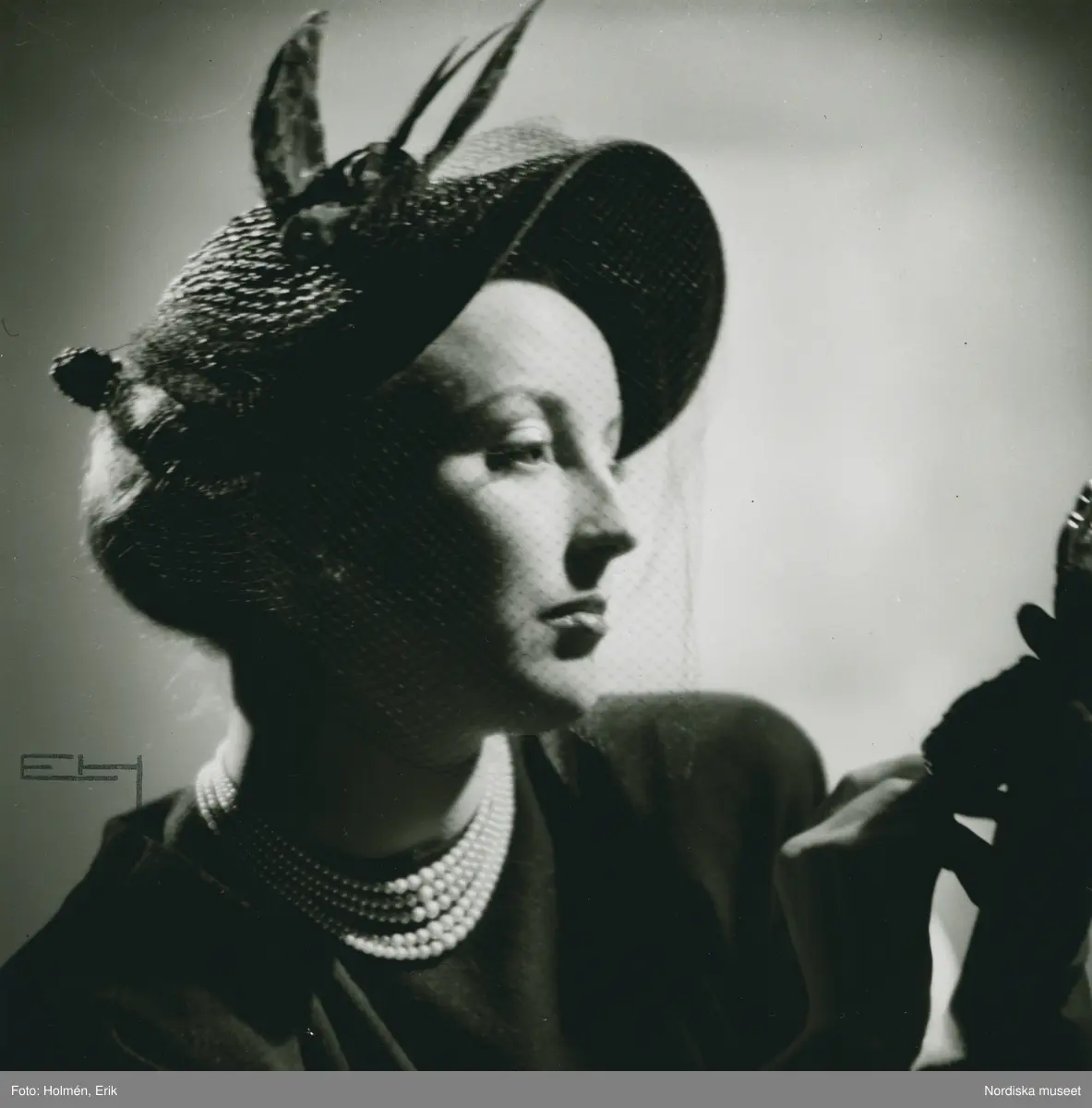 Porträtt av kvinna i svart strå- och sidenhatt med fågel. Modell av Maud Roser.