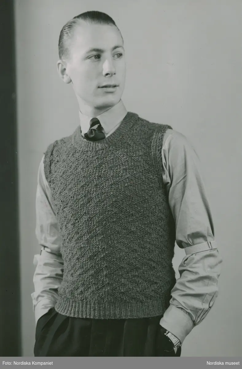 Ung man med bakåtkammat hår iklädd slipover, slips, skjorta med skjortärmshållare samt mörka byxor. Rektangulärt armbandsur. Nordiska Kompaniet. Text med blyerts på baksidan: "IH"