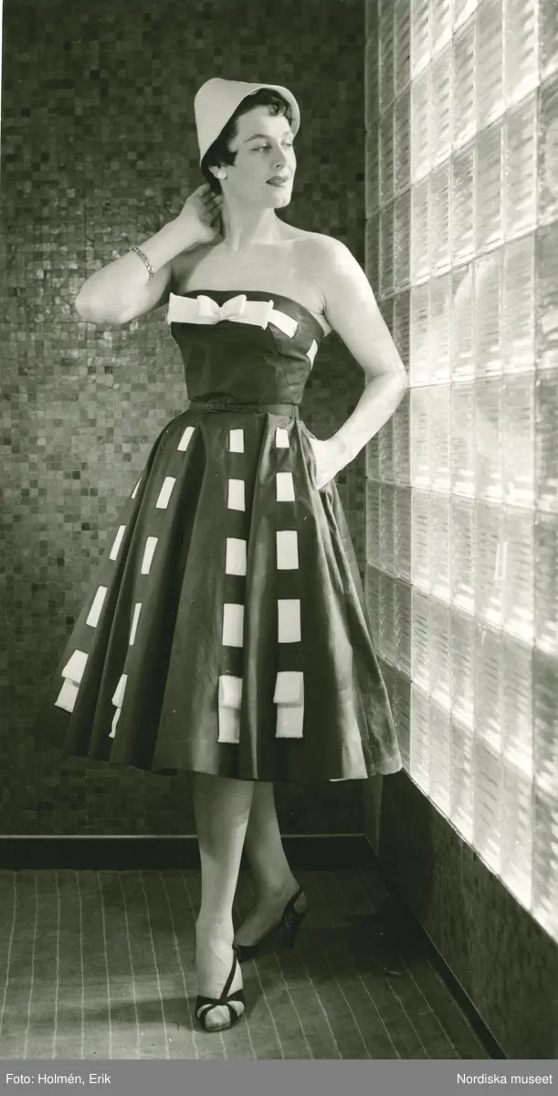 EM, Modellbutiken, Nordiska Kompaniet, Damkonfektion. Modell i axelbandslös klänning med vita dekorband, samt hatt och sandaletter. Betongglas och kakel i bakgrunden.