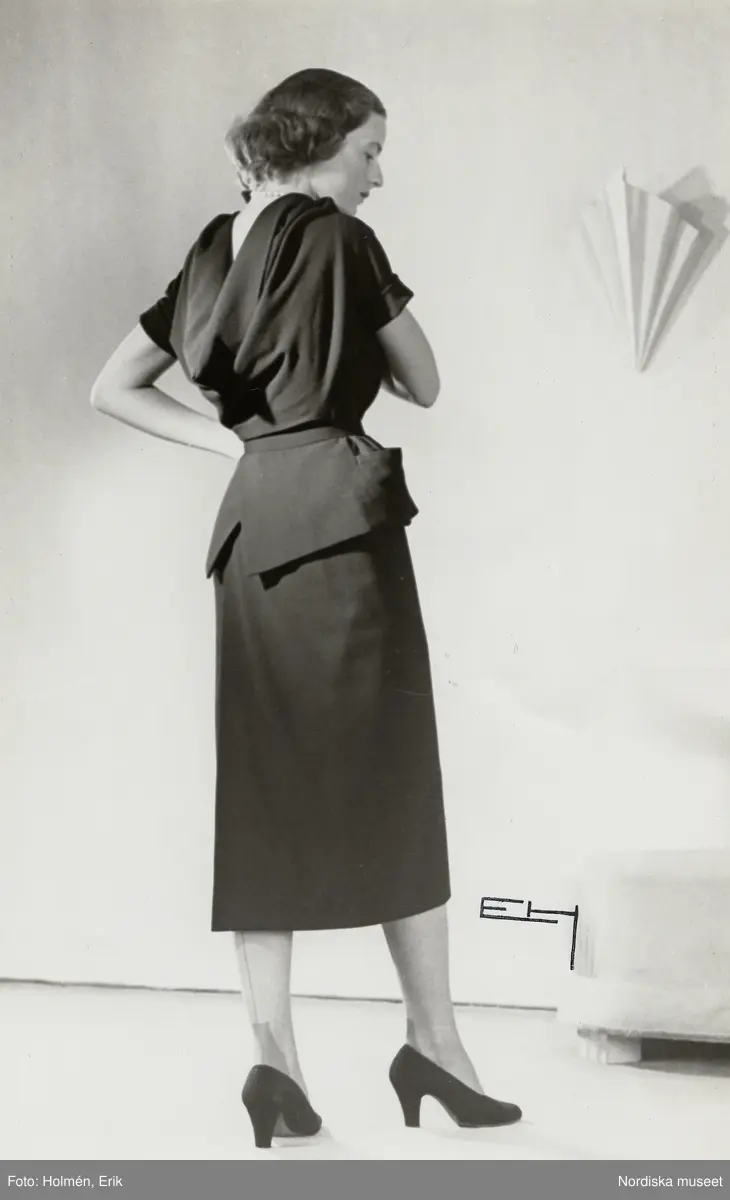 Nordiska Kompaniet. Kvinna i mörk klänning med hängande drapering i ryggen, korta ärmar. Text på baksidan: "Ch. Dior, Hösten -49"