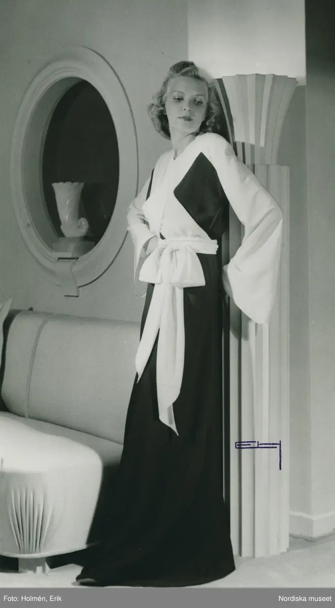 Helporträtt av kvinna i långklänning med vitt band i midjan och utsvängda ärmar.