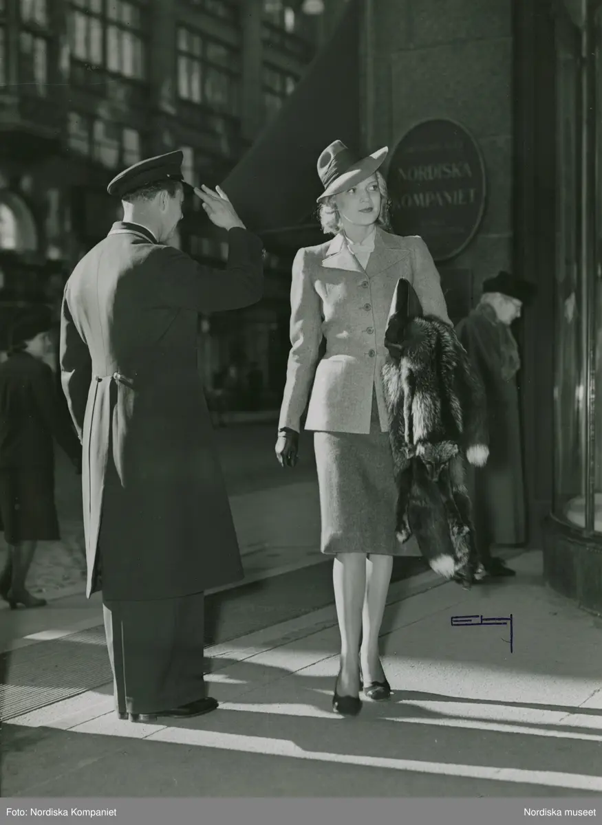 Uniformerad vaktmästare gör honnör för en modell utanför Nordiska Kompaniet. Hon bär hatt, ljus dräktjacka, mörkare kjol samt över ena armen en päls. Nordiska Kompaniet. Text med blyerts på baksidan: Pristävling B:M:T:s nya. Fru Millan köper julklappar"