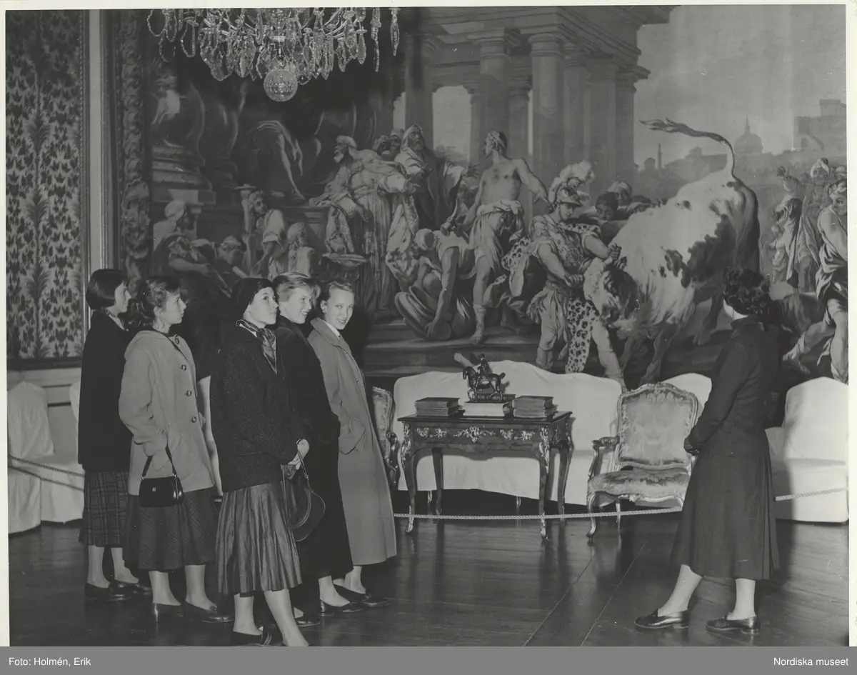Unga tjejer i jackor, kappor och kjolar tittar på väggmålning på Drottningholm Slott.