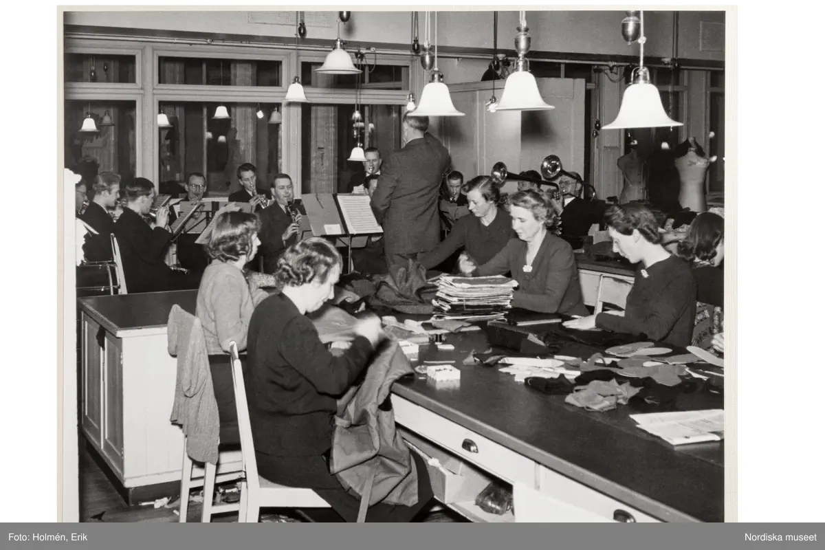 Beredskapssömnad till musik av NK:s (Nordiska Kompaniet) orkester. Kvinnor syr vid arbetsbord i ateljé. I bakgrunden spelar en orkester under ledning av dirigent.