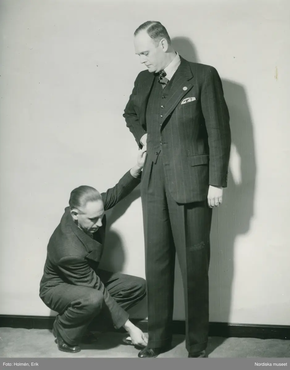 Skräddare mäter längden på byxorna på en man.