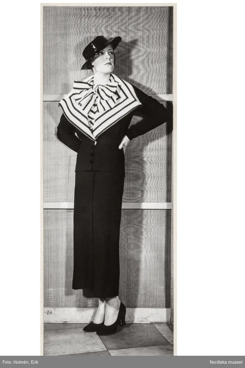 Mannekäng visar hellång kappa. Stor randig krage och rosett i halsen. Hatt och pumps. NK:s Franska damskrädderi, från Marcel Rochas.