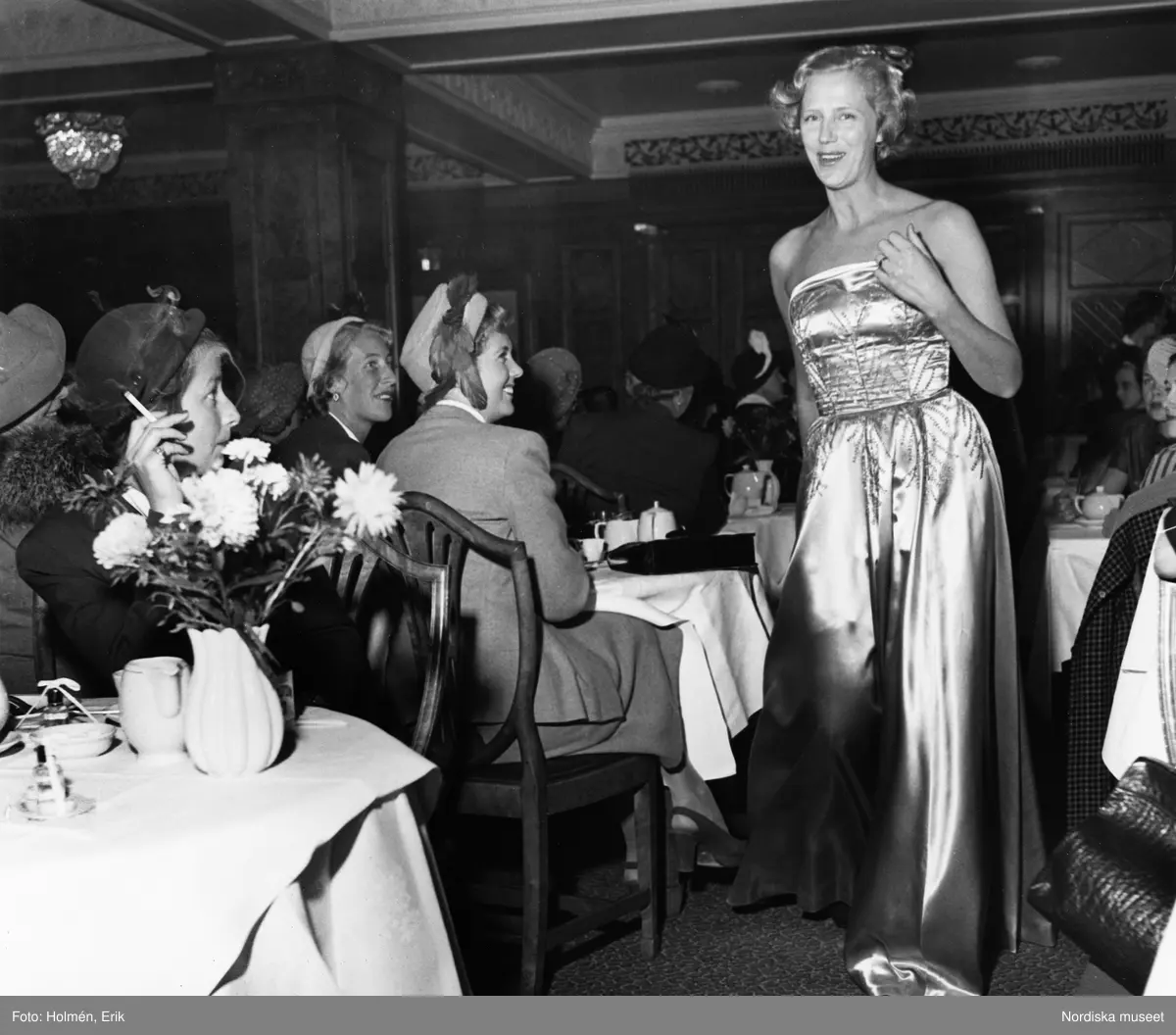 Modell i aftonklänning med paljettbroderi passerar åskådarna. Publiken sitter vid uppdukade bord med vita dukar, NK-servis och blommor i vas. De flesta kvinnorna bär hatt.