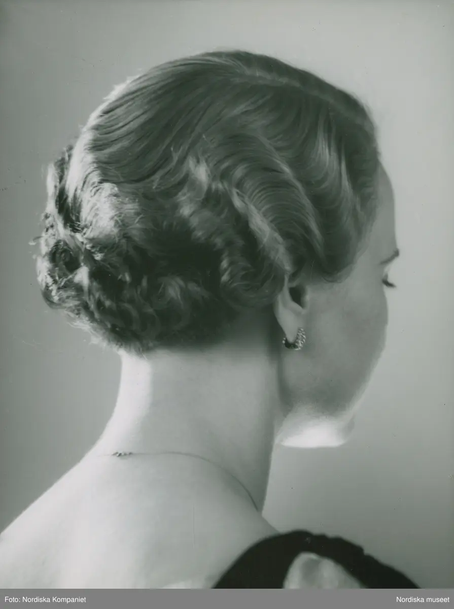 Kvinna med kort, vågig frisyr. Text med blyerts på baksidan: Hygieniska avd. Frisyrer (fru M Oldenburg, Arden)"