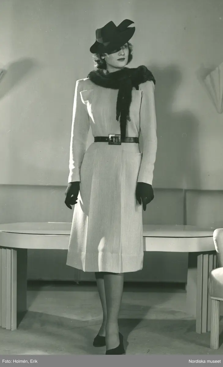 Helporträtt av en kvinna i kappa, hatt och minkboa.