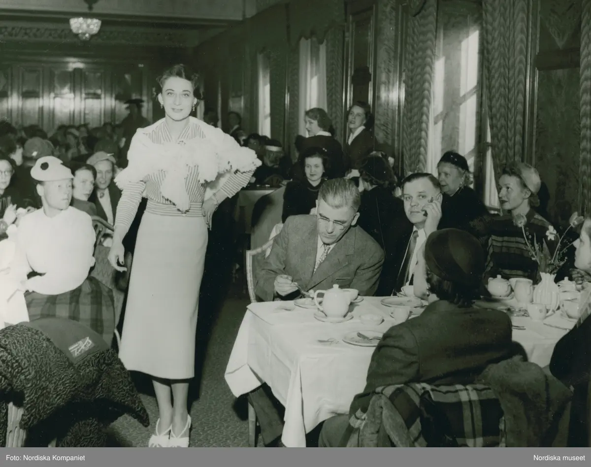 Modevisning på Nordiska Kompaniet, "Italiana". Modell i randig blus, vit sjal, kjol och sandaletter. Publik vid bord.