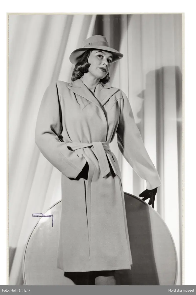 Mannekäng poserar iklädd kappa, hatt och hanskar. Vid modevisning på NK:s Franska damskrädderi.