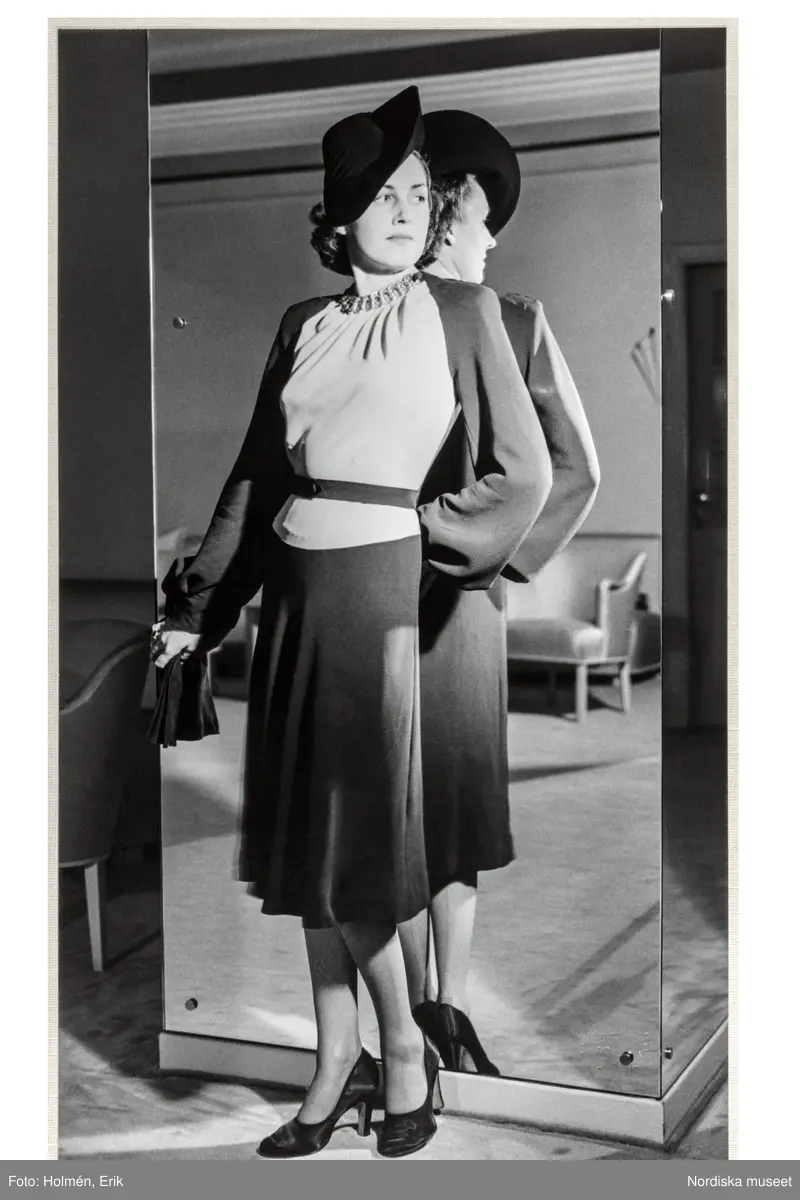 Mannekäng visar plagg framför spegel i provrum. Klänning, knälång med rund hals, markerade axlar och långa vida ärmar med manschett. Skärp i midjan. Livets framstycke i avvikande ljusare tyg. Hatt, handskar och pumps. NK:s Franska damskrädderi.