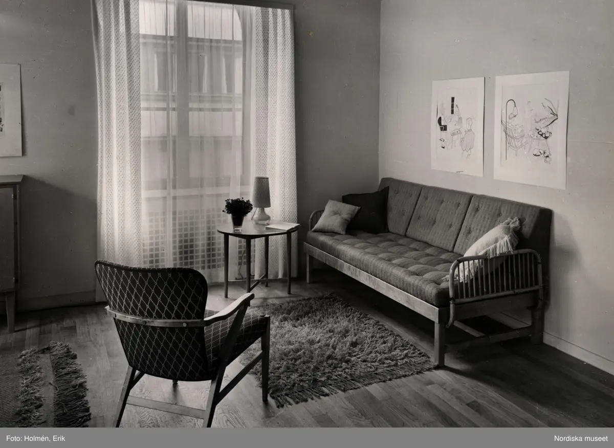 Interiör. "Hemmet som växer", vardagsrum. Soffa och fåtölj vid fönster. Nordiska Kompaniet.