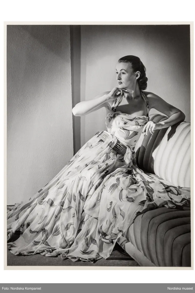 Mannekängen Kim Söderlund poserar sittande i soffa. Hon är iklädd hellång, ärmlös festklänning av mönstrat tyg. Axelband och vid kjol. NK:s Franska damskrädderi.