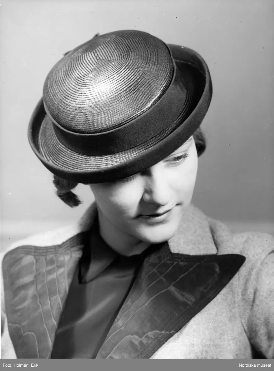 Kvinnlig modell i hatt med ripsband. Nordiska Kompaniet, Stockholm.