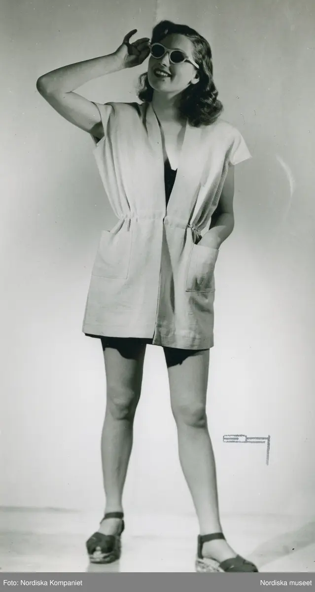 Från utställningen "Kaliforna". Modell i kortärmad jacka med dragsko i midjan, sandaler och solglasögon.