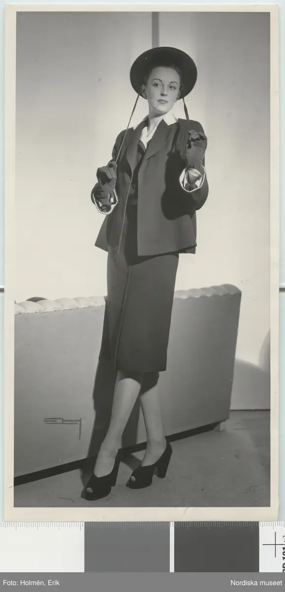 Nordiska Kompaniet. Kvinna i mörk klänning och vid jacka med ljus krage. Hatt med långa band. Mörka handskar, skor med öppen tå. Text på baksidan: "Molyneux"