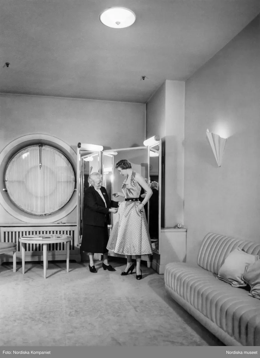 Kvinna provar prickig klänning i provrummet vid NK:s Franska damskrädderi. Hon assisteras av äldre kvinna i mörk dräkt; proverskan Greta Nisshammar (1892-1982) en av ateljéns trotjänare. När hon gick i pension 1965 hade hon tjänstgjort i drygt 40 år.