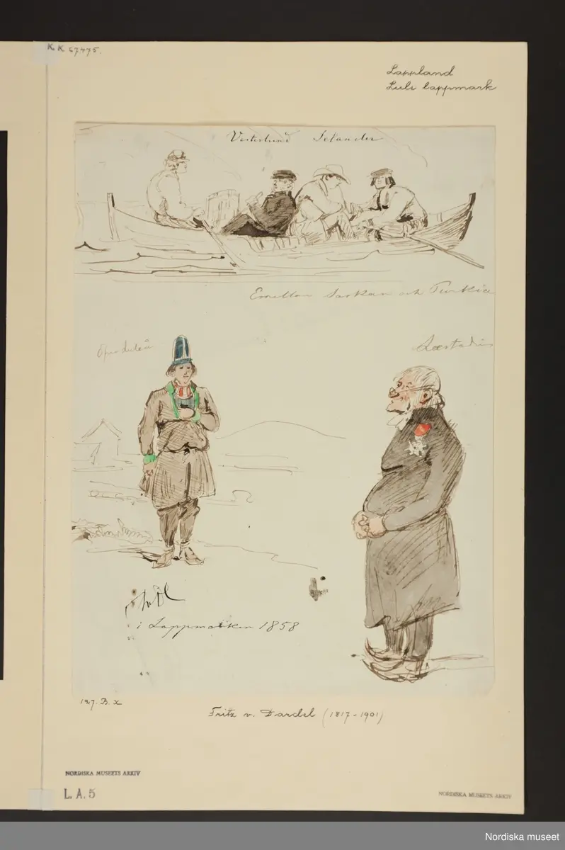Teckning av Fritz von Dardel. Same möter Laestadius i Lappmarken samt två passagerare, Vinterlund och Selander, och två roddare i en båt. Daterad 1858. L.A. 5