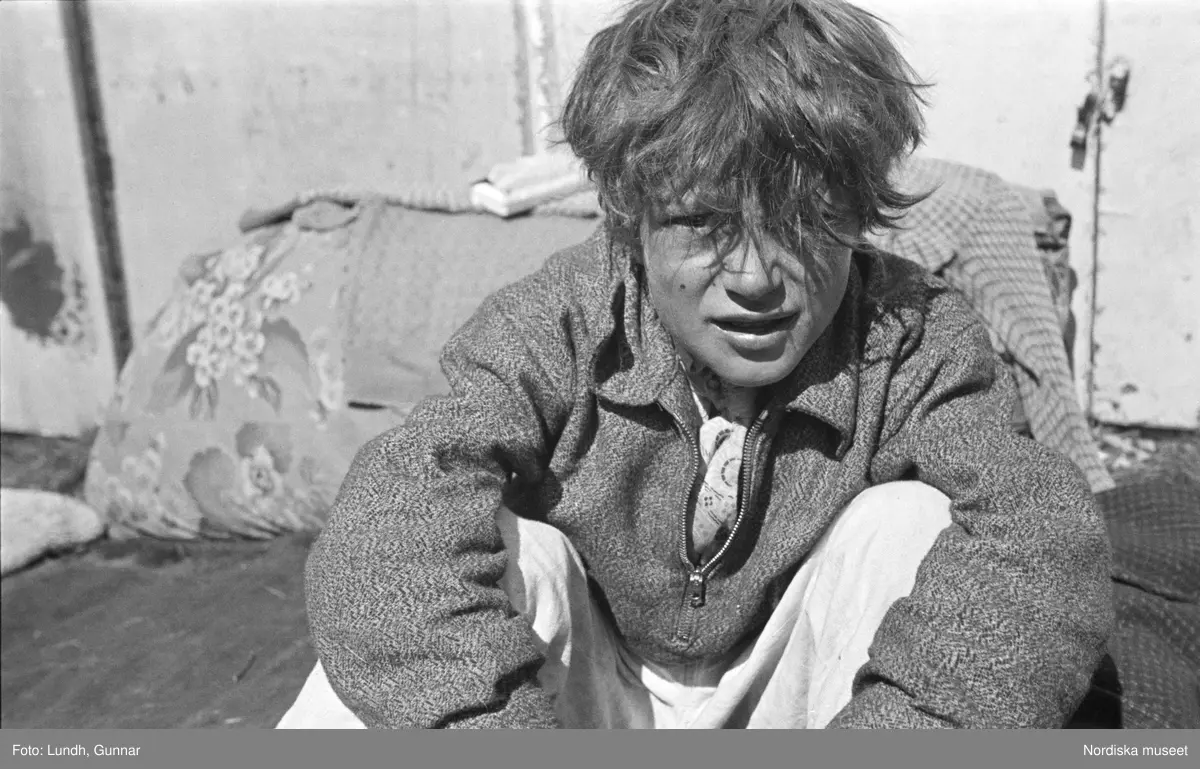Porträtt av sittande ung pojke med luggen i ögonen. Familjen Taikons läger i Johanneshov, södra Stockholm.