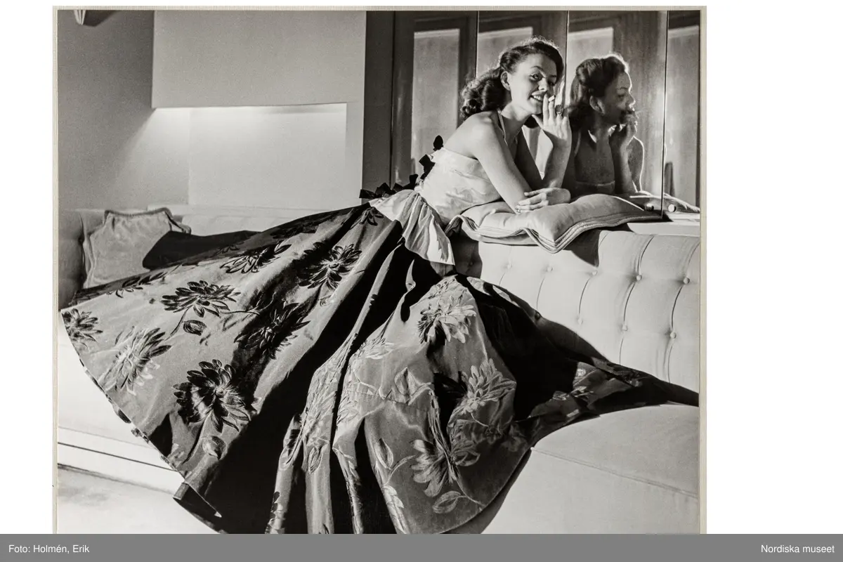 Modell poserar i soffa. Hon är iklädd aftonklänning med lång, vid kjol av blommigt, blankt tyg. Liv med bara axlar i ljusare tyg. I handen en cigarrett. NK:s Franska damskrädderi.