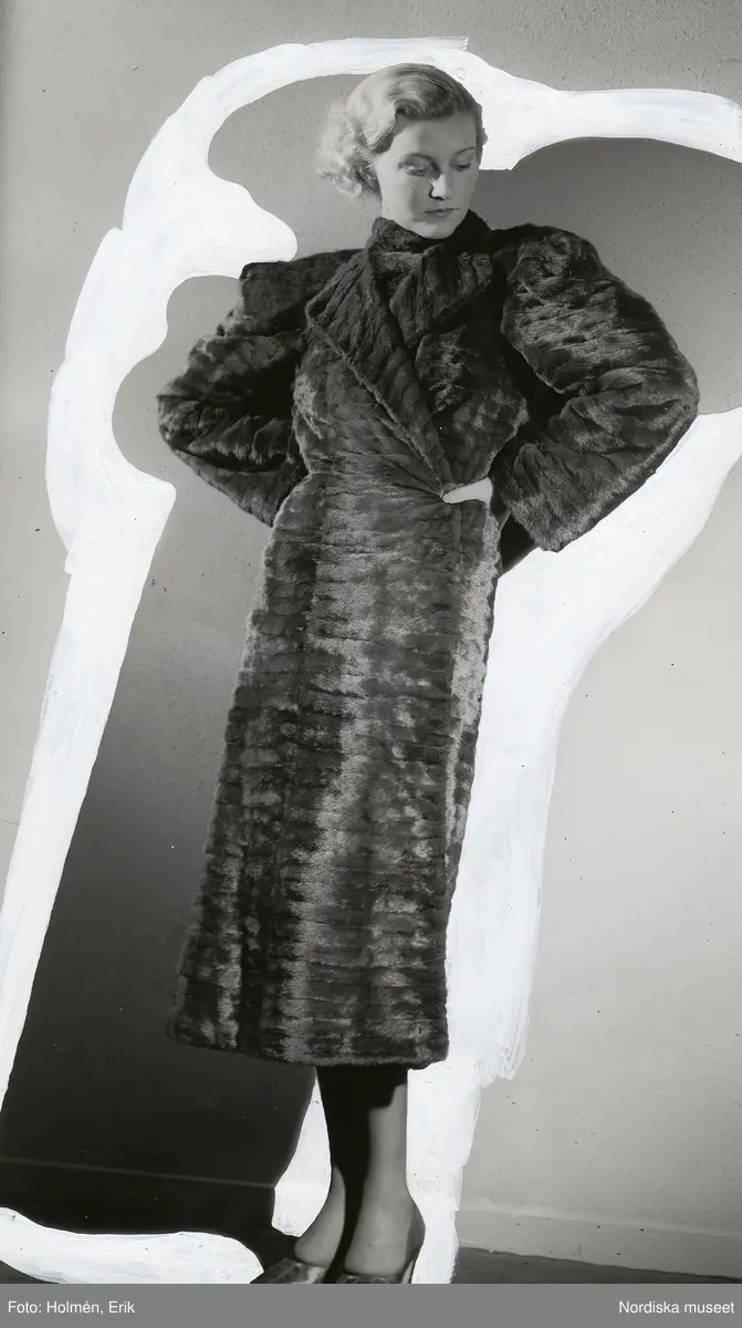 Nordiska Kompaniet. Kvinna i mörk, horisontellt randad pälskappa med vida ärmar.