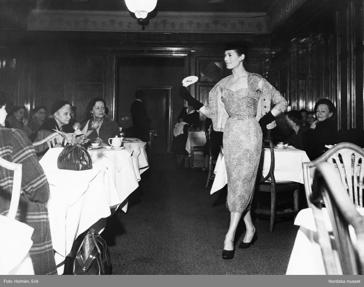 Salén-visning i lunchrummet på Nordiska Kompaniet. Modell klädd i mönstrad klänning med tillhörande jacka, svarta handskar, hatt, pumps och örhängen passerar åskådarna. Modellen håller upp en skylt som visr 205SEK.