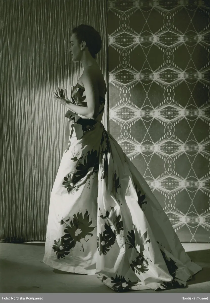 Modell i aftonklänning med blommigt mönster och rosett. Från Patou. Textilier i bakgrunden.