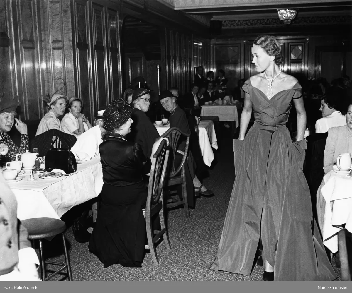 Konfektionsvisning i lunchrummet på Nordiska Kompaniet. Modell klädd i aftonklänning med slits framtill, tvåradigt pärlhalsband och mörka pumps passerar publiken. Åskådarna sitter vid uppdukade bord med vita dukar och NK-servis. De flesta kvinnorna i publiken bär hatt.