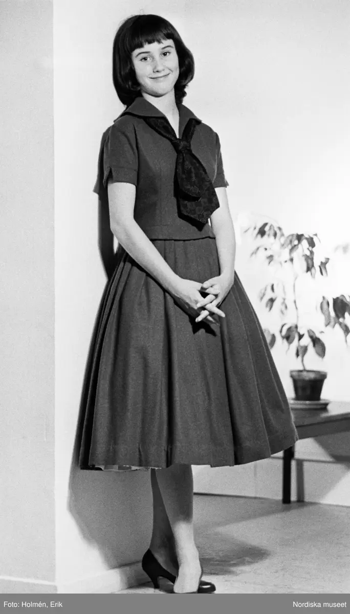 Modell i Tonnie-Modeller. Utställd kjol, kortärmad överdel och slips,100% ylle, 120 SEK. I bakgrunden syns ett lågt bord och en krukväxt.