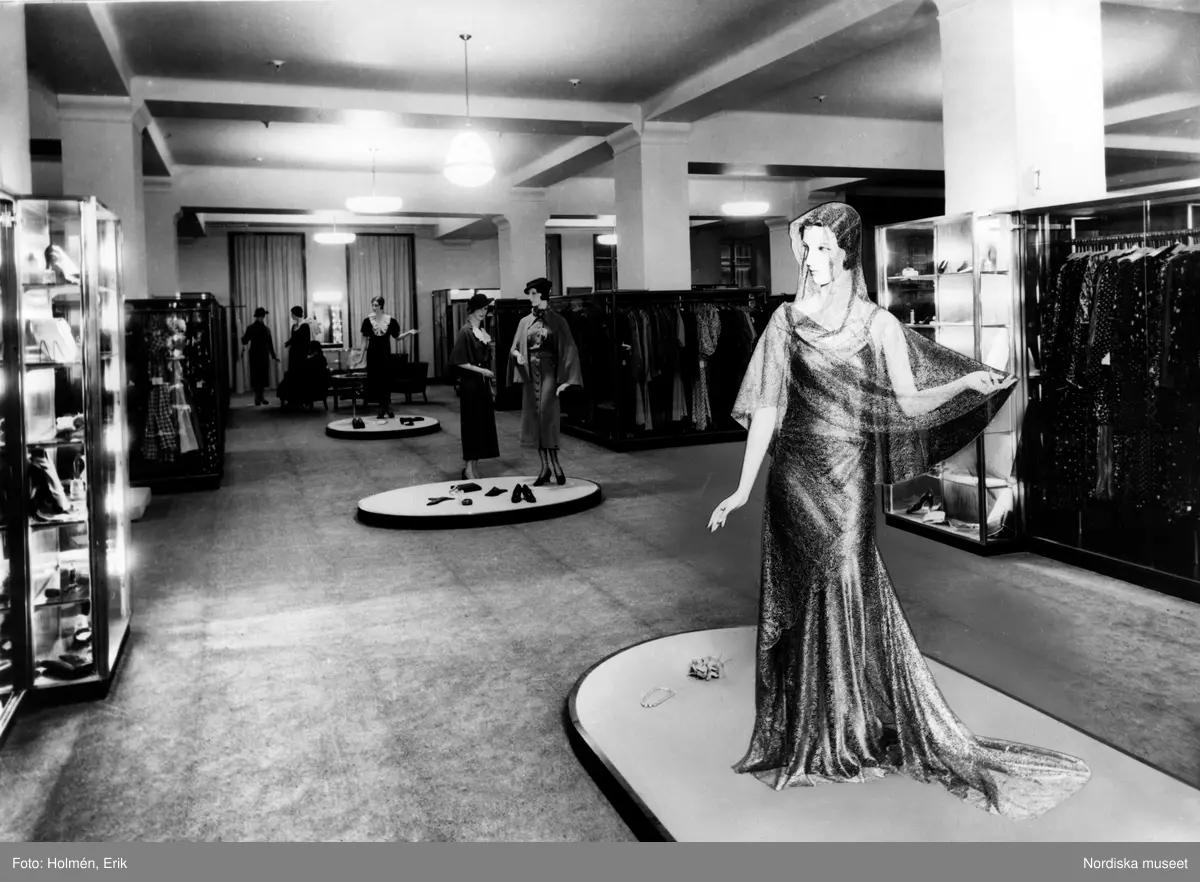 Interiör från Nordiska Kompaniet, damkonfektionsavdelning. Skyltdockor på podie. Kläder och accessoarer i glasmontrar.
