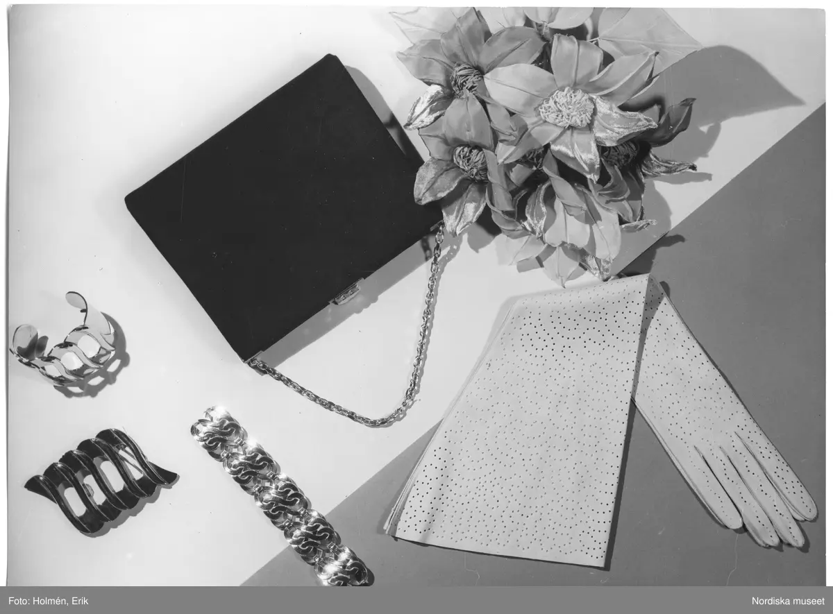 Kollage av accessoarer. Den franska minaudière eller "cocktailbagen" i svart antilop med kedja av guldmetall. Aftonhandske i perforerad glacé. Armband och skärpspänne ( garnityr ) i kraftigt utförande, guldmetall. Blomster.