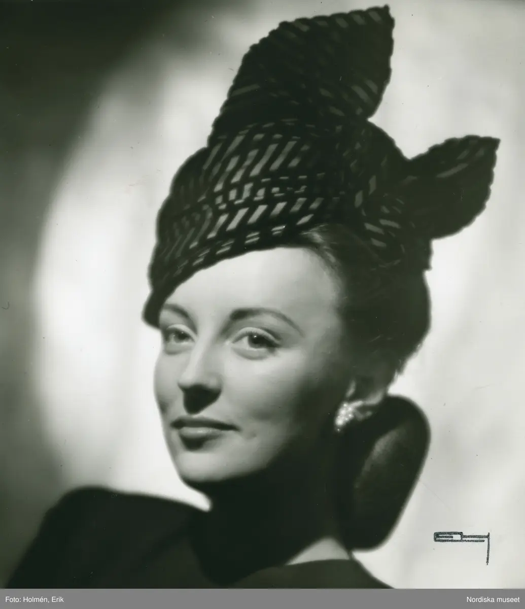 Porträtt av kvinna, möjligen modellen Hjördis Grundel-Starenius i turban i randig textil, samt örhängen och chinjong, från Claude S:t Cyr.