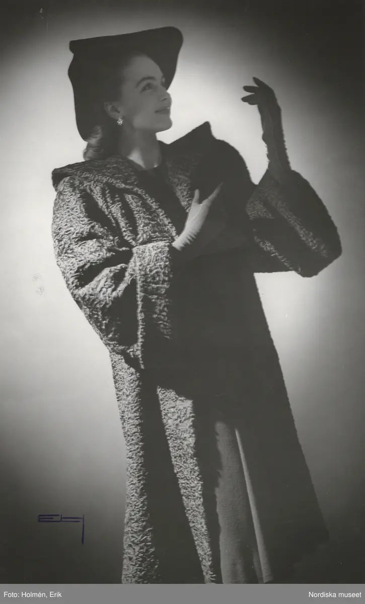 Nordiska Kompaniet. Kvinna i persianpäls och svart hatt.