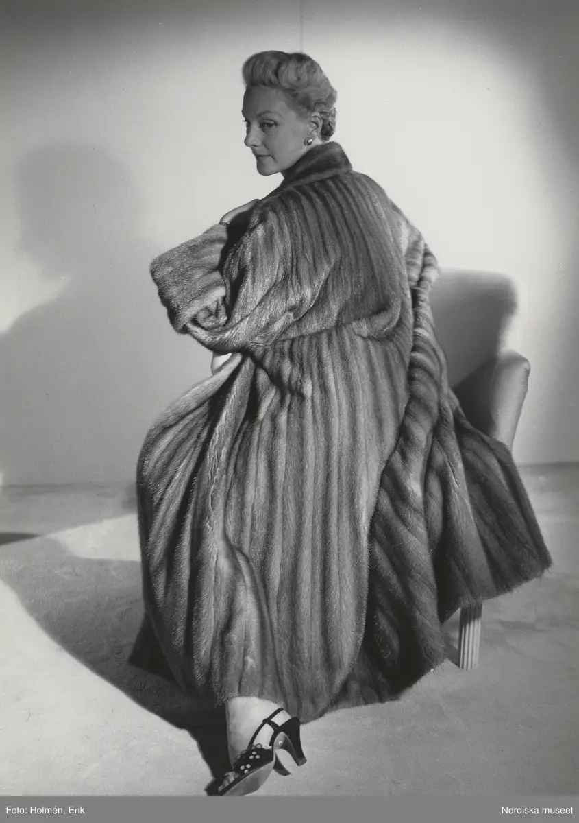 Nordiska Kompaniet. Kvinna i vid päls med vida ärmar med breda uppslag. Text på baksidan: "Mink Sept 1953"