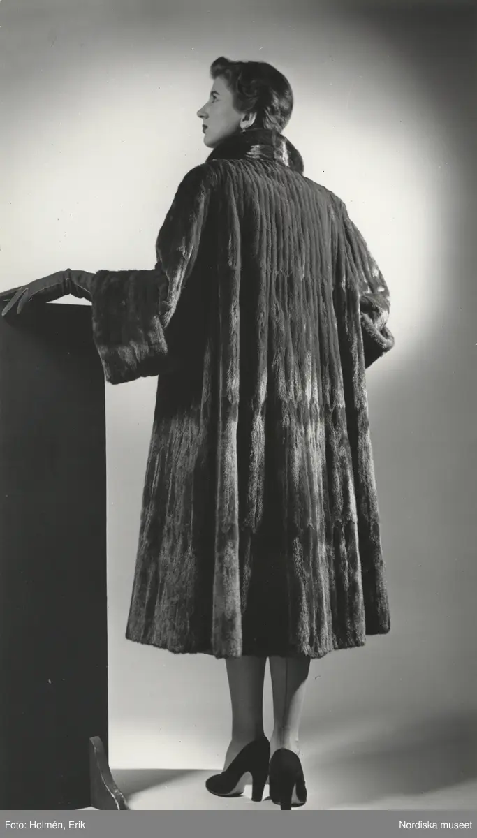 Nordiska Kompaniet. Kvinna i mörk päls med smala åsar över skuldrepartiet. Text på baksidan: "Horowitz rysk f. hermelin 1951"