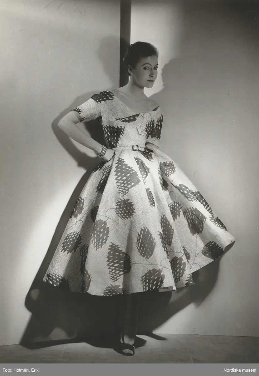 Modell i mönstrad klänning med vid kjol och skärp. Från Jacques Fath.