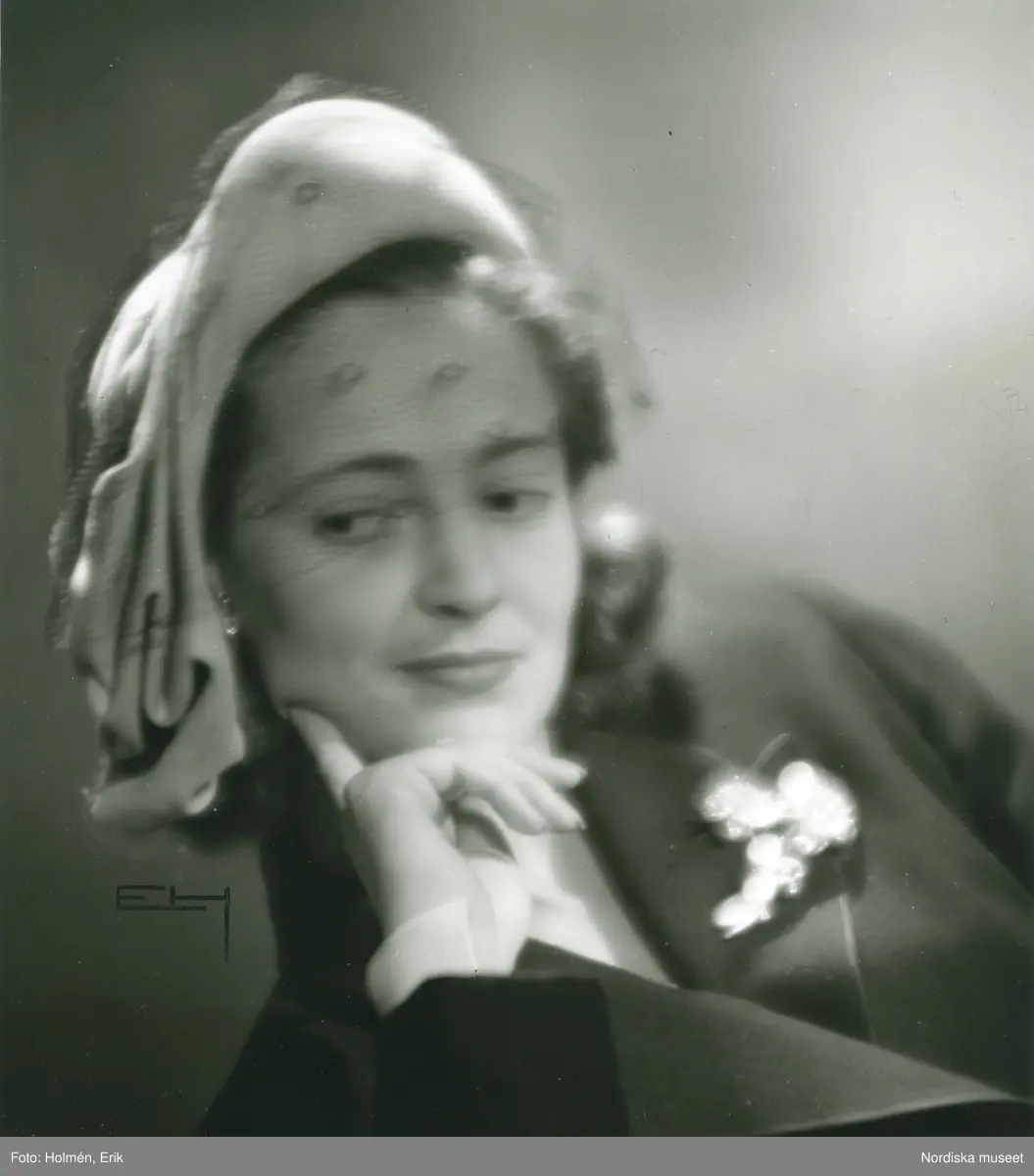 Porträtt av kvinna med hatt i beige duvetine av Claude S:t Cyr. Hatt använd vid franska avdelningens uppvisning september 1947.