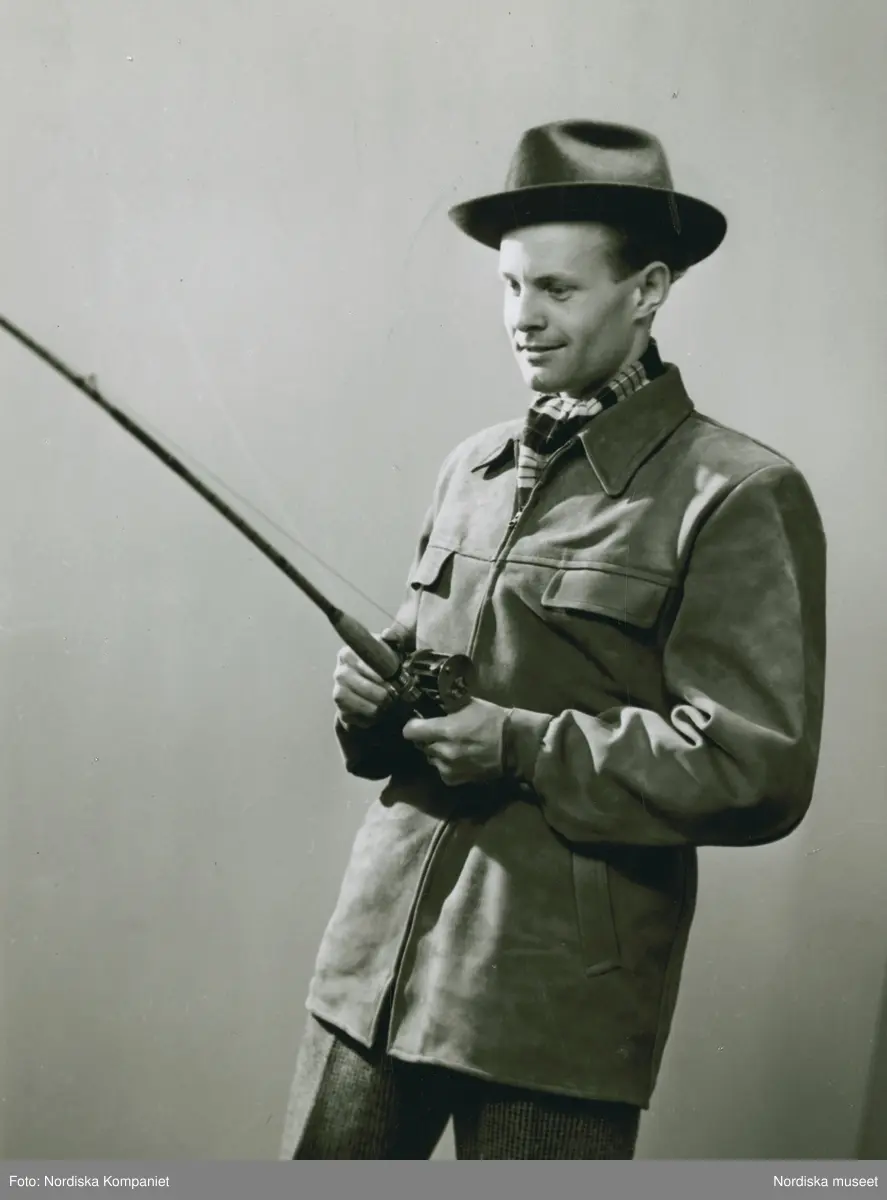 Man iklädd hatt, rutig halsduk samt en skinnjacka från C O Ericson, Malung. I handen håller han ett fiskespö. Nordiska Kompaniet. Text med blyerts på baksidan: "C.O. Ericson, Malung Lädermarknad 1949"