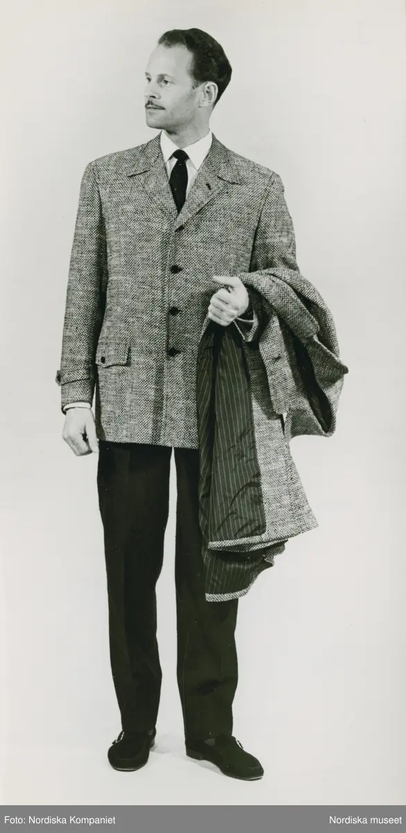 Man klädd melerad kavaj, vit skjorta och slips. Över ena armen bär han en rock i samma tyg som kavajen. Mörka byxor, mörka skor. Nordiska Kompaniet.