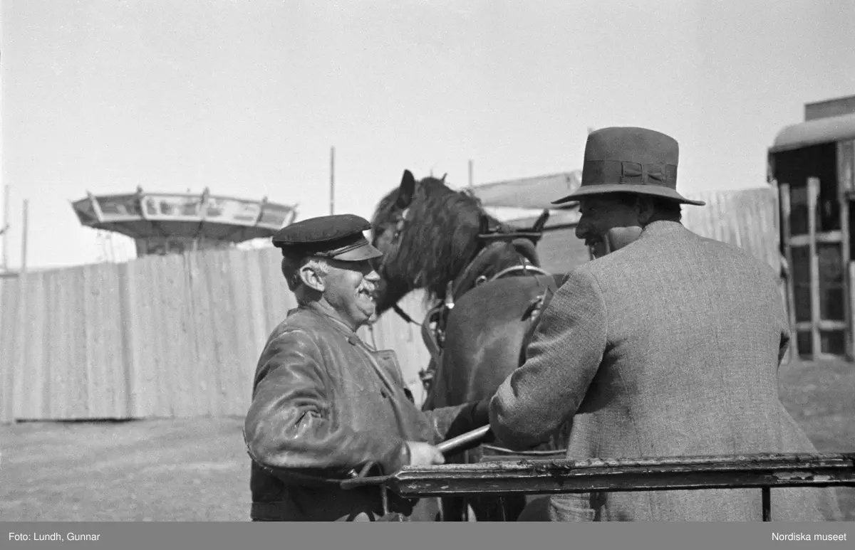 Bild av två samtalande män, den ene i vagn spänd bakom häst och den andre stående intill. Familjen Taikons läger vid Johanneshov, södra Stockholm