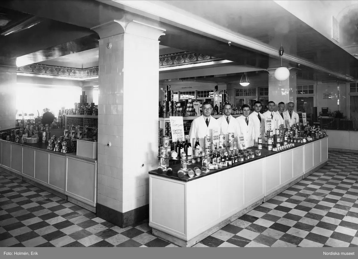Konservavdelningen. Manliga expediter bakom varudisken, Nordiska Kompaniet.