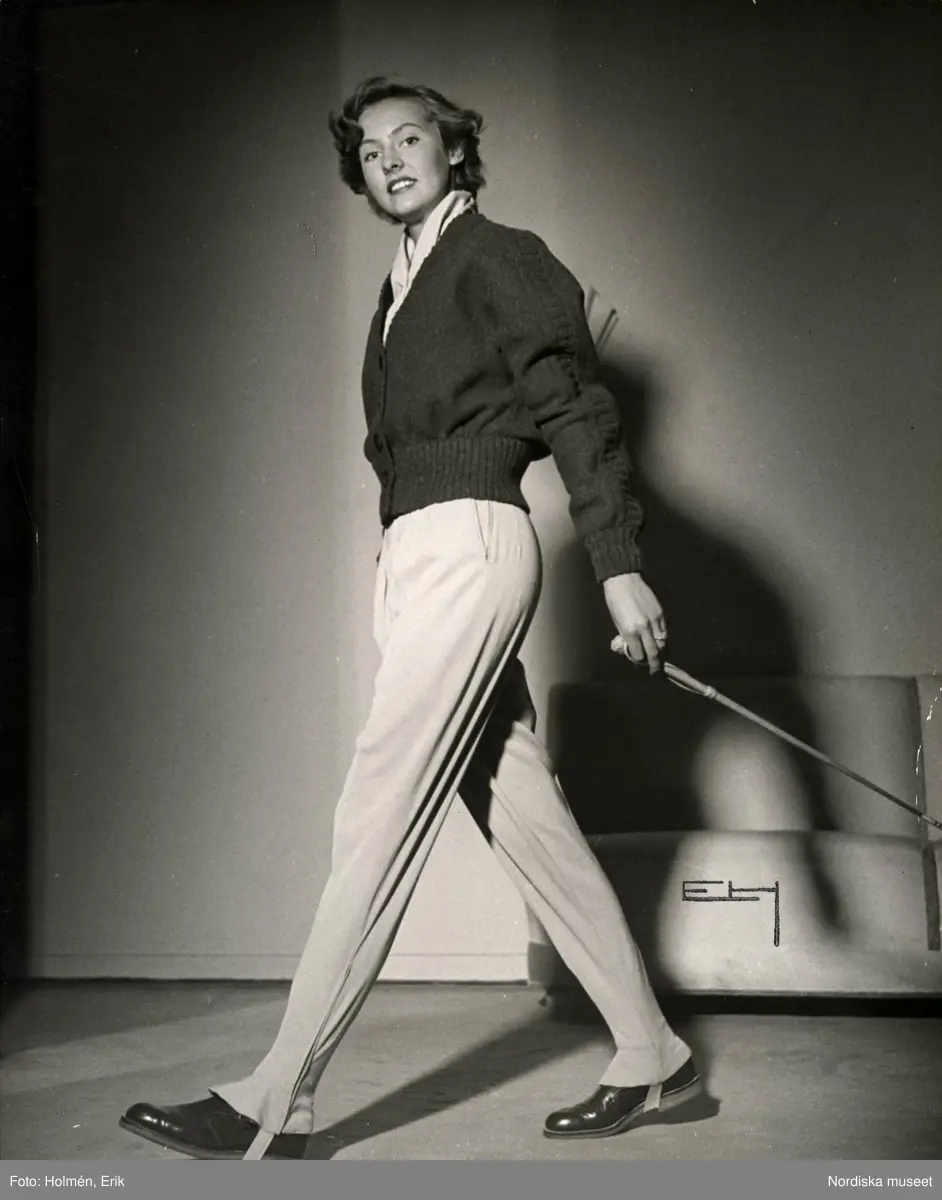 Höstmode för dam från Madeleine de Rauch. Stickad tröja i lumbermodell, byxa och ridspö på Nordiska Kompaniet i Stockholm.