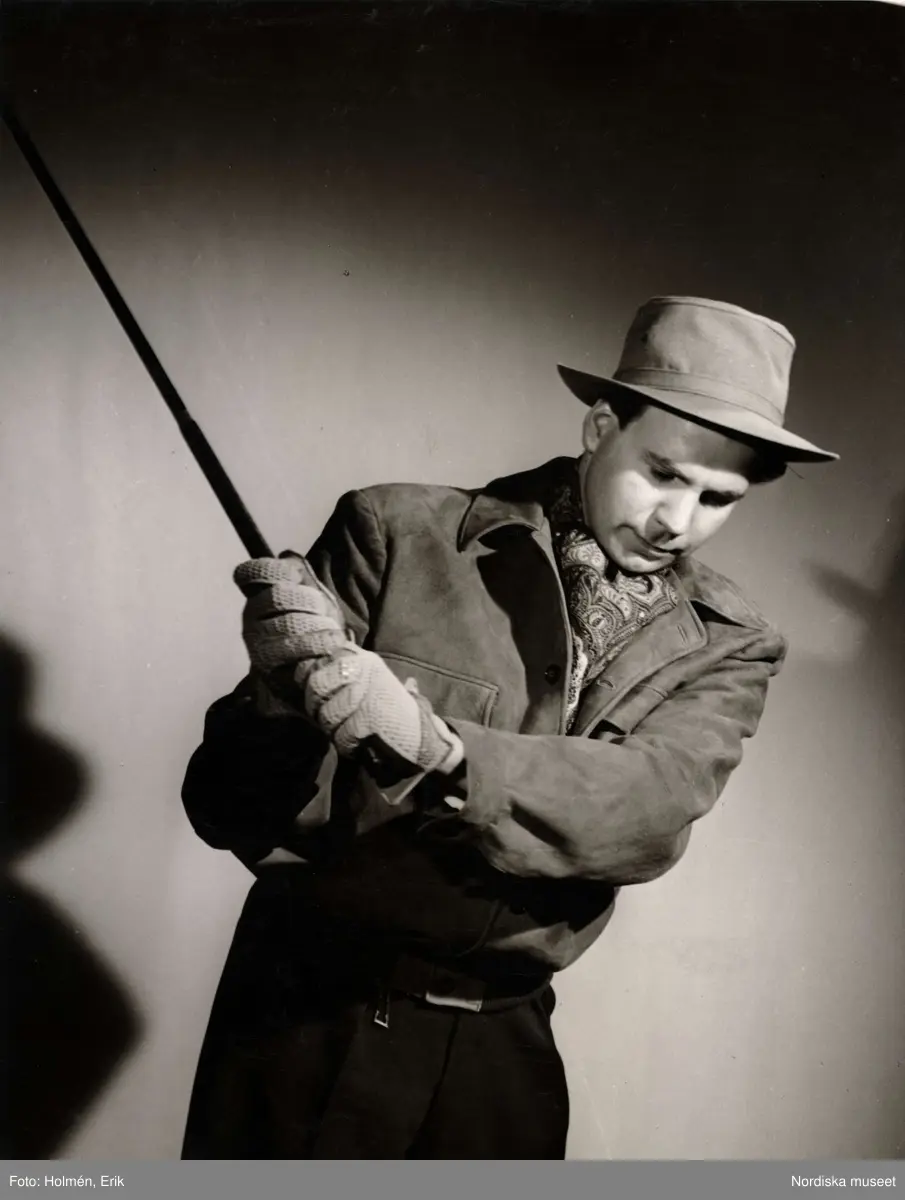 Man iklädd mockajacka och hatt, med golfklubba. Nordiska Kompaniet.
