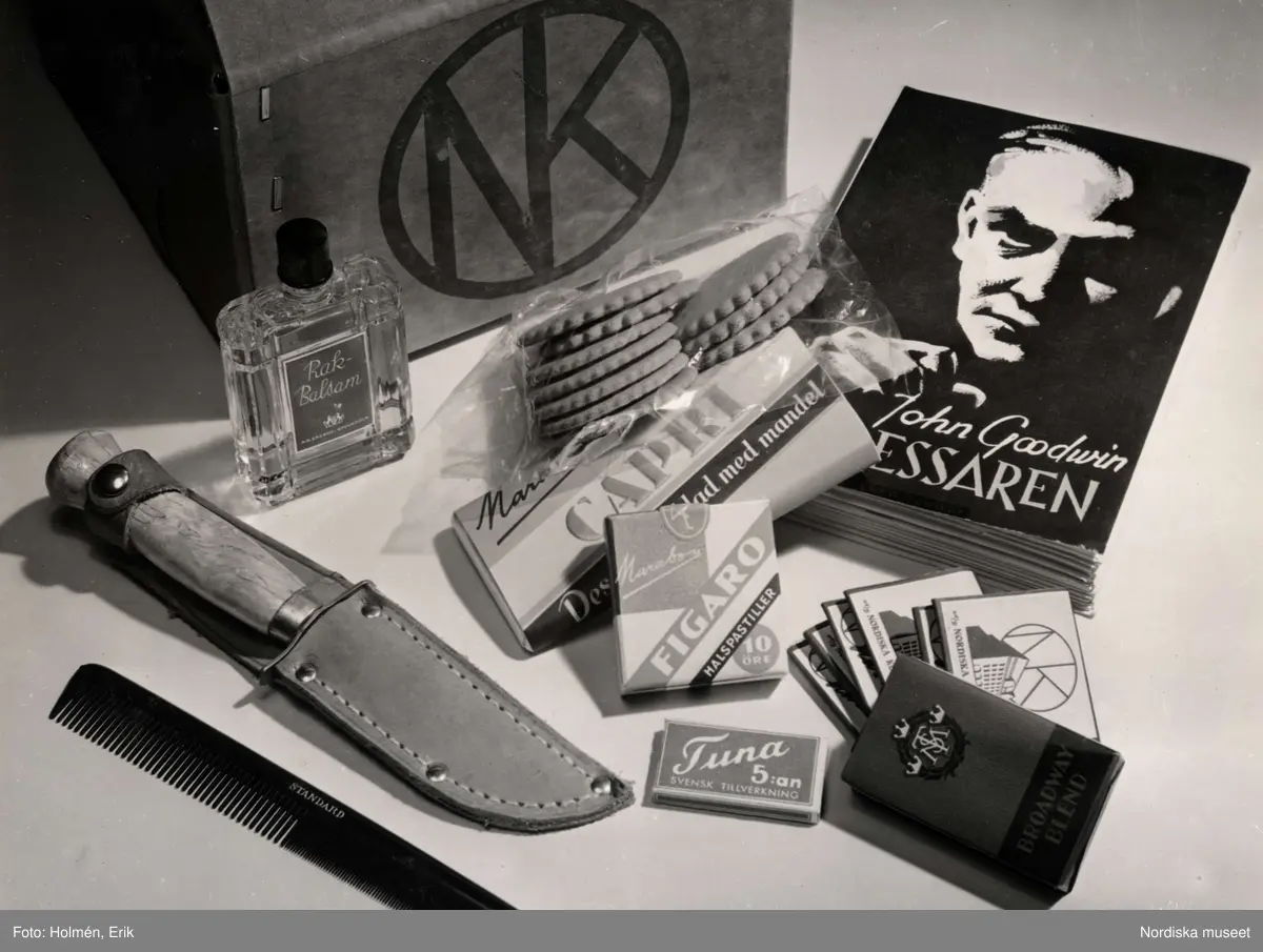 Fältjulklappar från Nordiska Kompaniet 1940, däribland rakbalsam, kniv, kam, Figaro halspastiller, John Goodwins bok Utpressaren, kakor med mera.